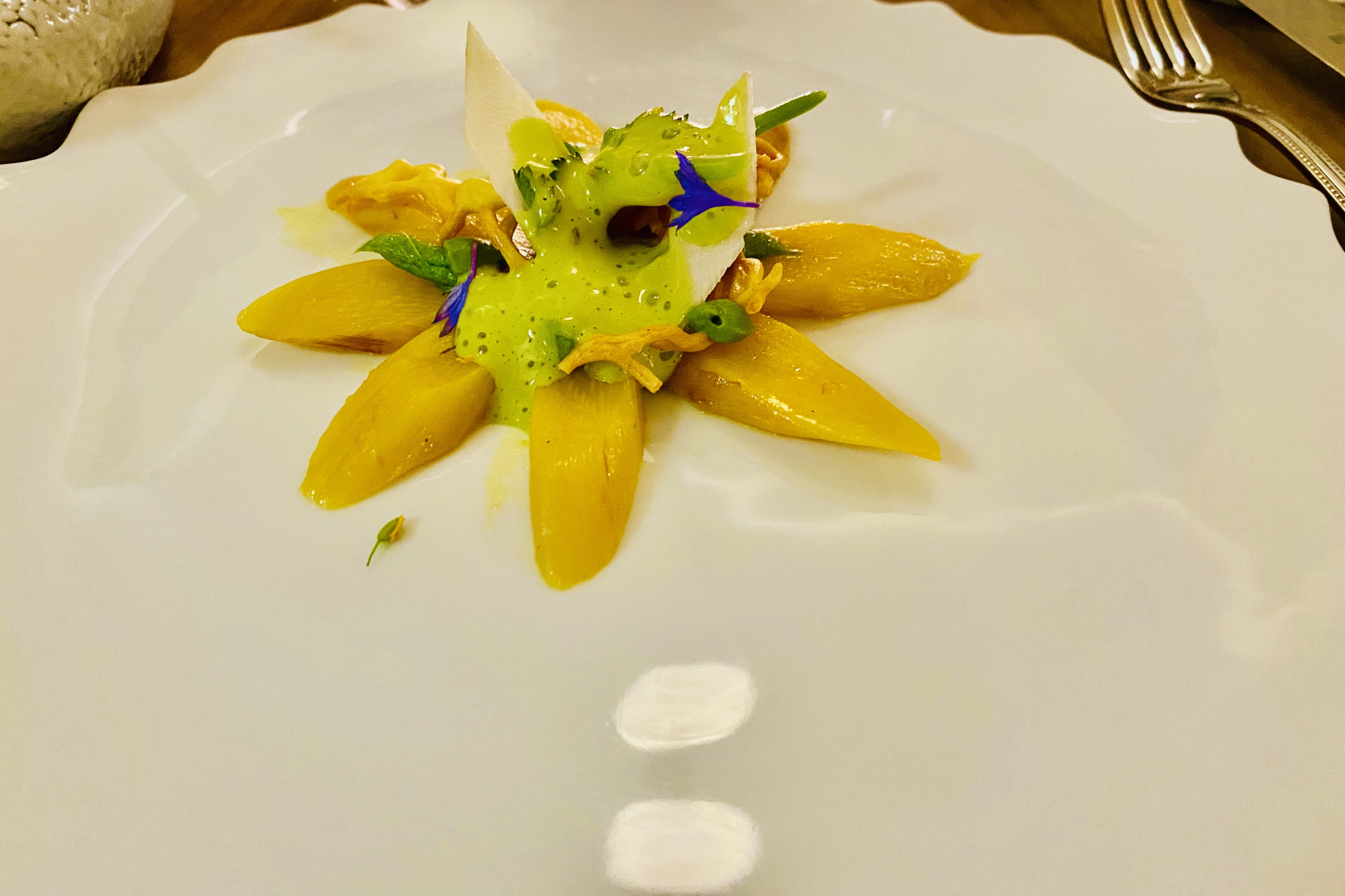 I have to be honest and say I really don't like white asparagus, because I find them bland, but Granite made me a believer. They infused the asparagus with some secret sauce and saffron, topped with a mild citrus and pea sauce. I'm starting to think they like peas or they're in season. But this dish was so succulent with delicate flavors and just a beautiful composition. Bravo.