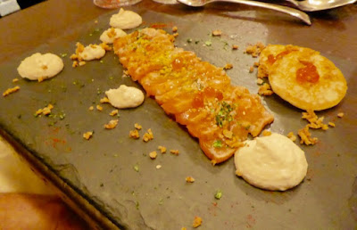 Tarte au citron revisités sablé Breton, (Lemon shortbread tart revisited Brittany). At first bite, I thought, wow, not very much lemon taste to it. Then my friend said, take a bite from the top, which I did, and I definitely tasted the tart characteristics of the lemon. The dessert is deceiving, because it looks like all lemon curd, when in fact it was piped over ice cream that sat atop a shortbread crust. Hence, when I took the initial bite, I had more ice cream than the actual lemon curd. It' a very good dessert, very refreshing and lemon lovers will not be disappointed.